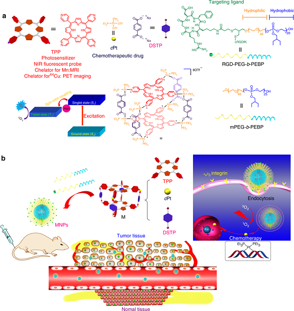 (a) TPP、cPt、DSTP、M、mPEG-b-PEBP和RGD-PEGb-PEBP的分子结构;