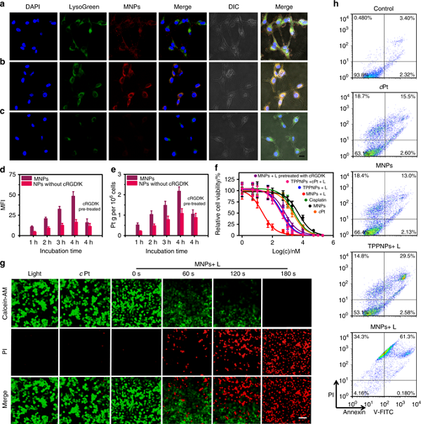 (e) 在不使用cRGDfK的MNPs或NPs处理不同孵育时间后,U87MG细胞内的铂含量;