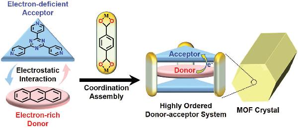 利用主-客体MOF晶体构筑给体-受体系统策略的示意图。