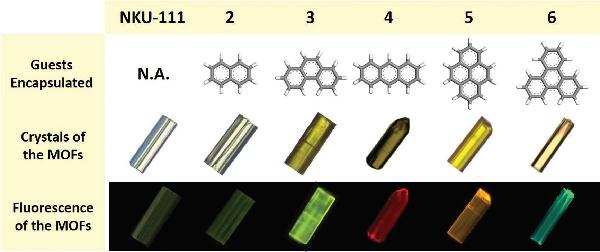NKU-111⊃客体晶体随客体变化的光学(中间)和发光(底部)图像。