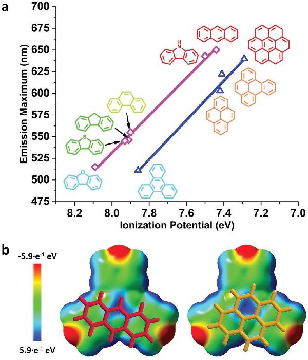 a) NKU-111的发射最大值与客体电离电位之间的相关性,客体骨架相关的线性相关性以不同颜色的线呈现;