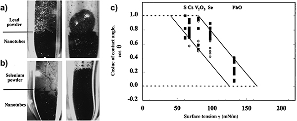 (a) 熔融铅在CNT表面形成球状液滴,表明液体铅不浸润CNT;