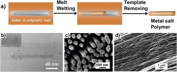 (a) 通过熔融浸润限域策略在一维纳米通道中制备纳米材料示意图;
