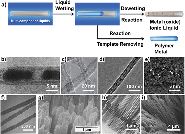 (a) 通过液体浸润限域策略在一维纳米通道中制备纳米材料示意图;