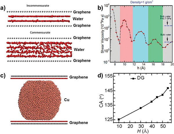 (b) 两个石墨烯层间纳米通道中限域水的剪切粘度与距离h的关系,当h减小时,剪切粘度不仅迅速增强,而且表现出明显的振荡;