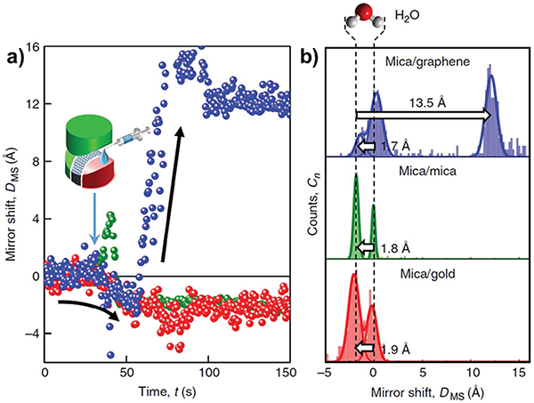 (b) 云母-石墨烯表面之间迅速形成1.3纳米厚的界面液膜,证明电解质快速浸润石墨烯表面。