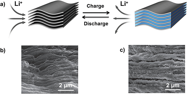 (e) 在二维纳米通道中限域Li用于电池充放电;