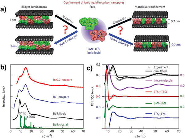 (b) EMI-TFSI在0.7nm孔(红色),在1nm孔(蓝色),体相EMI-TFSI液体(黑色)和EMI-TFSI晶体(绿色)的X射线散射图;