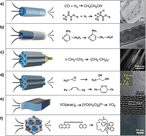 (d) 介孔二氧化硅纳米通道中纳米限域催化的示意图和填充有催化纳米颗粒的SBA-15的TEM图像;