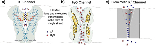 (c) 仿生人工K+纳米通道在圆柱的临界区域具有巨大的整流特性,表明人工纳米通道体系也具有量子限域超流特性。