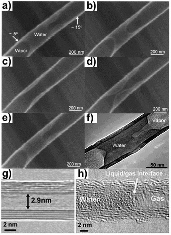 (c, d) CNT中水在电子束加热下的状态:水膨胀到疏水状态,同时气体在高压下溶解到液体中;