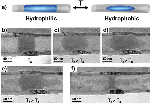 (a) 通过温度调控一维纳米通道中亲疏水转变示意图;