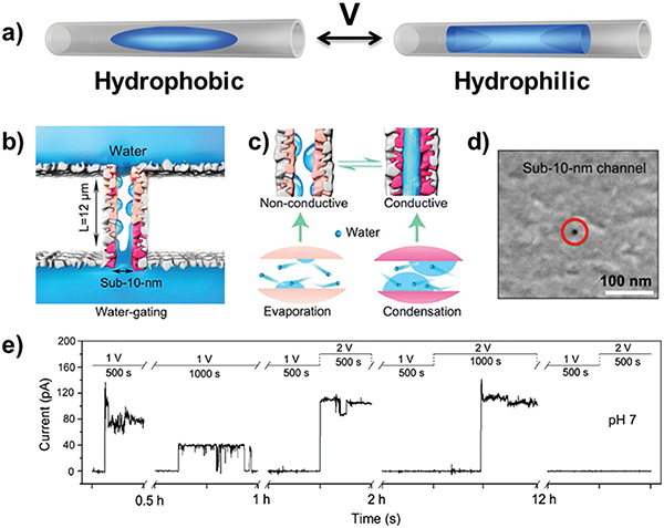 (e) 当pH=7,带负电荷的纳米通道可通过电压调控疏水和亲水状态的转变。
