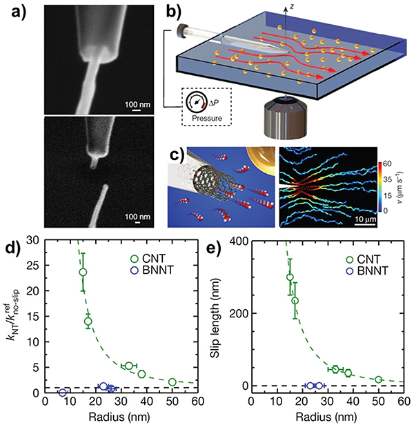 (e) 单个BNNT和CNT的水滑移长度与纳米管半径的关系。