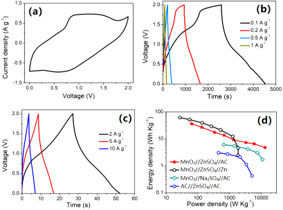 图2. MnO2//ZnSO4 (aq)//AC锌离子混合超级电容器电化学性能测试