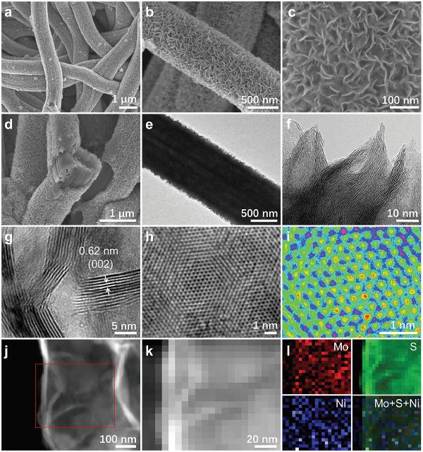 MCM@MoS2-Ni保持了MCM@MoS2的原始形貌,并未发生明显变化(如图2a,b)。从放大的FESEM以及TEM图像中清楚地看出,MCM@MoS2-Ni复合物是由超薄纳米片MoS2-Ni垂直生长于MCM而形成(图2c,e),尽管由于MoS2-Ni纳米片与MCM纳米纤维之间的紧密接触而使得其核-壳结构难以辨别, 但是MCM@MoS2-Ni的多孔道结构还是可以通过横截面视图直接观察到(图2d)。高分辨TEM图像和傅里叶变换(FFT)滤波图像清楚地显示了Ni修饰的MoS2基面具有明显缺陷 (图2h,i)。HAADF-STEM图像证实纳米片的光滑表面没有任何明显的纳米颗粒或团簇(图2j)。电子能量损失谱(EELS)表明Mo和S元素在整个架构上的均匀分布(图2k,l)。与分布在整个扫描区域上的Mo和S物种的情况不同,Ni物种只存在于特定位置上。上述结果表明修饰的Ni原子孤立存在于MoS2纳米片上,而没有聚集。