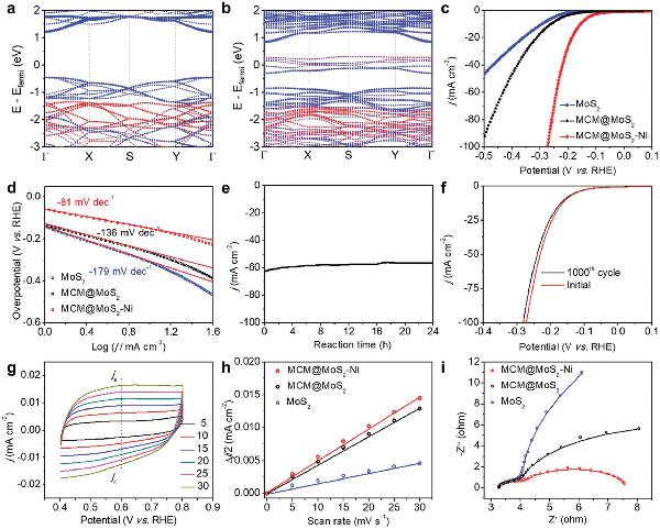作者对MCM@MoS2-Ni的电催化HER性能进行了研究,以探索单原子结构表面调节的贡献。通过密度泛函理论(DFT)计算充分证实了新的能带结构的生成。新生成的能带结构可以直接提高与Ni原子配位的S原子对H吸附的吉布斯自由能, 进而促进反应的进行。为了确认DFT预测,作者通过LSV曲线来研究催化剂在0.5 M H2SO4中的电催化HER性能。如图4c和4d所示,MoS2和MCM的复合可以有效地加速电催化动力学,从而提高催化性能。此外,Ni单原子的表面修饰则可以进一步促进本征活性位点的生成,进一步提高反应速率。为了研究MCM@MoS2-Ni催化剂的稳定性,作者进行了恒电位下的长期稳定性测试和连续的LSV扫描。MCM@MoS2-Ni的电流密度在24 h内保持基本稳定 (图4e),1000次循环后LSV曲线出现较小偏移,进一步证明了电催化剂的高稳定性(图4f)。作者还通过研究双层电容(Cdl)来评估电化学活性表面积(ECSA)(图4g,h)。电化学阻抗谱(EIS)拟合结果证明MCM@MoS2-Ni的电荷转移电阻远小于MCM@MoS2和原始MoS2 (图4i)。从上述结果可以看出,MCM@MoS2-Ni活性的显著增强很与其增强的电子传递效率以及增加的本征活性位点有关。