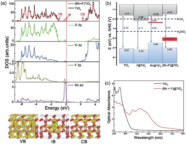 光吸收是光催化分解水的首要步骤,增强材料的光吸收是提高太阳能转换效率的关键之一。传统的块体材料,如TiO2、ZrO2和SrTiO3,通常拥有相对较宽的带隙(>3.0 eV),只能吸收紫外光,难以利用占太阳能最多的可见光和红外光。 因此,迫切需要减小带隙以增强光吸收。掺杂和共掺杂是减少半导体带隙的可行途径,以具有宽带隙的TiO2块体材料共掺杂为例。在TiO2中掺杂金属或非金属元素可有效地缩小TiO2的带隙,然而仅掺杂单一元素很可能降低载流子迁移率并引入新的重组中心。 因此,研究人员开发了两种原子共掺杂的策略来调节TiO2的带隙。此外,在表面修饰半导体中引入内建电场也可对带隙进行调控。