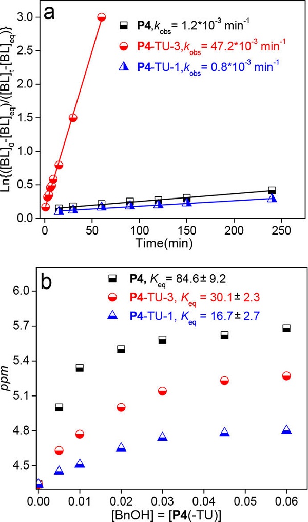 Figure 1. (a){-[BL]0-[BL]eq/([BL]t – [BL]eq)}对-40 ℃ γ-BL的ROP时间的一阶图-BL/P4/BnOH = 300/1/1; γ-BL/P4/TU-3 /BnOH = 300/1/1/1; γ-BL/P4/TU-1/BnOH = 300/1/1/1。(b)结合体系的化学位移与C6D6中25 ℃的BnOH和P4(-TU),[BnOH] = [P4(-TU)]浓度的化学位移图。