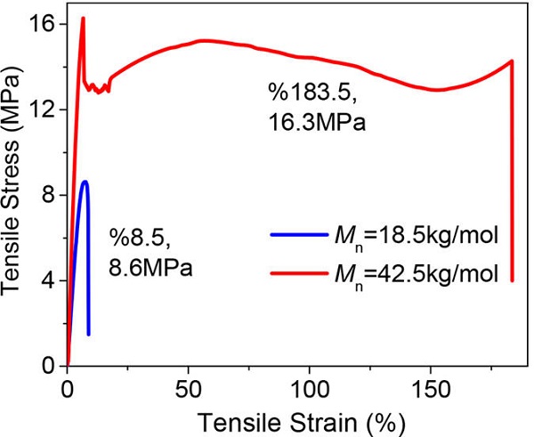 图六、为了证明PγBLs的MWs对力学性能的影响,比较研究了不同MWs的PγBLs的应力-应变行为。Figure 4所示,Mn为42.5 kg/mol的PγBL的极限拉伸强度在室温下的断裂伸长率为183.5%,拉伸强度为16.3 MPa,而Mn为18.5 kg / mol的PγBL表现出来。失效应变仅为8.5%,抗拉强度为8.6 MPa。