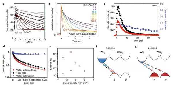(e)大扭转角WSe2/MoS2异质结构中,载流子浓度的函数的空穴群(蓝色)和自旋谷(红色)寿命图;