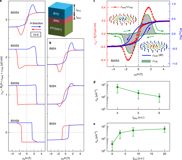 d,e,相对于tSRO和tBTO的斯格明子密度(nsk)计算。误差条为不确定性载流子自旋极化PS=-10±5%。