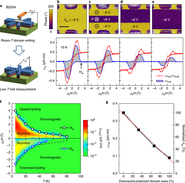 b-e,不同FE极化状态下B20S4样品的压电响应力显微镜(PFM)相图(上图),ρxy-H和ρTHE-H曲线(下图)。b中的比例尺对应于10μm。将ρTHE降至零的临界H标记为Hsk。