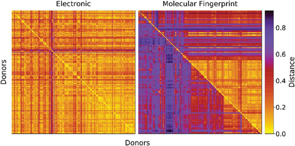 左:电子参数之间的欧几里德距离。右图:使用两种指纹算法(上三角形:日光指纹。下三角形:摩根指纹)计算的分子指纹结构距离。