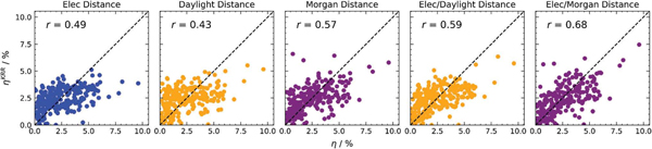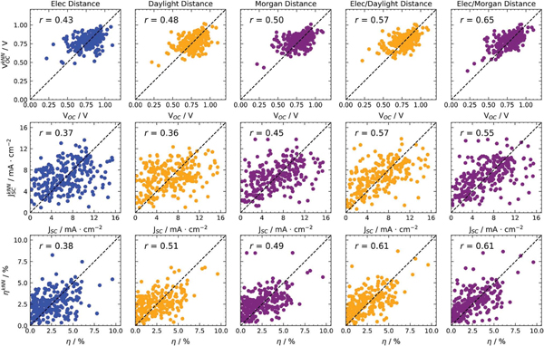基于各个距离的光伏参数的k-NN(k=3)回归预测,在每列的顶部指示。颜色仅编码电子属性(蓝色),或使用的分子指纹类型(黄色为日光指纹,品红色为摩根指纹)