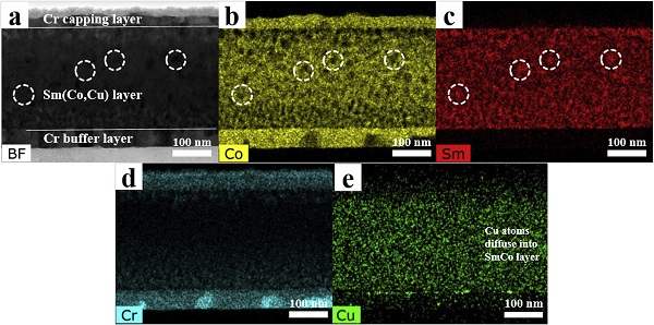 一些富Sm (SmCo5)的区域开始出现。富Sm区域(虚线圆)在整个SmCo层中几乎是均匀分布的,并被大部分的富Co ( Sm2Co17)相包覆。通过引入Cu层来诱导SmCo5相的形成。铜层在退火后消失的主要原因如下:结晶激活能与熔点有关。Cu的激活能低于Cr,因为前者的熔点(1083℃)低于后者(1853℃)。因此,Cr原子的扩散并不明显。