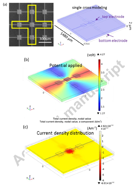 图3. 单个传感单元周围电流密度分布的数值模拟。超高电流浓度说明了相邻单元的量可以忽略的串扰。(a)有限元模型;(c)潜在分配;(d)电流密度分布。