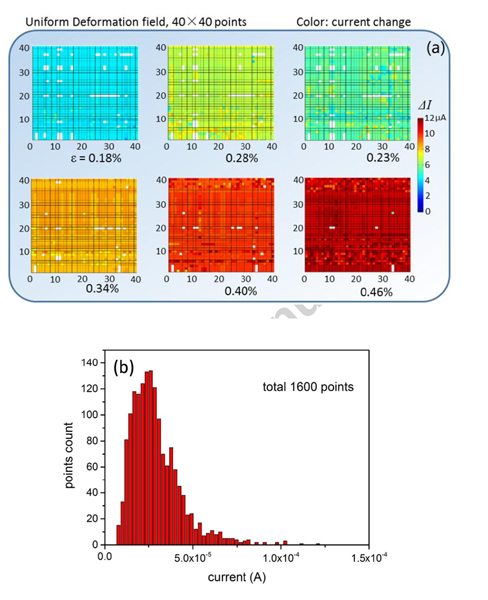 图4. 薄膜压电晶体管阵列的电学与力学性能。(a)在均匀拉伸载荷期间40×40单元的当前演变:应变映射,单元的电流变化由不同颜色描述。(b)卸载时总共1600个单位的当前统计数据。
