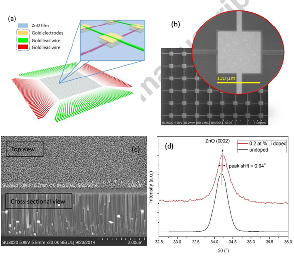 (a)ZnO连续薄膜压电晶体管阵列的示意图;(b)传感器阵列的微结构;(c)RF溅射ZnO膜的表面和柱结构的顶视图和截面图;(d)显示ZnO生长的XRD光谱沿c轴。