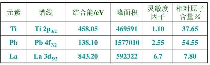 2)元素的定量分析:根据能谱图中光电子谱线强度(光电子峰的面积)反应原子的含量或相对浓度。