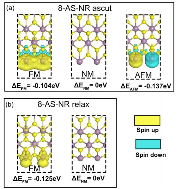 (a)在Mo边缘处具有FM,NM和AFM状态的切割AS-NR(NZ=8)的自旋电荷分布和相对总能量分布图;