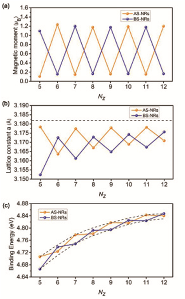 (a)1T’-MoS2 NRs的磁矩随NZ的变化周期性振荡图;