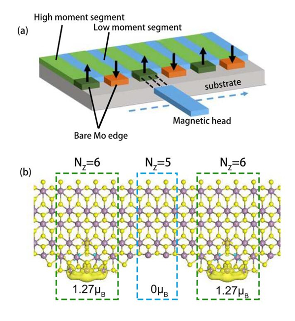 (a)单层MoS2 NR的信息存储装置的原型图,不同NZ(高磁矩或低磁矩)的段组成(黑色箭头:自旋极化方向);