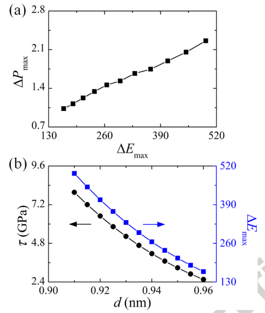 图3. 理论计算结果。(a)当层间距离从0.96 nm减小到0.91 nm时,最大极化改变(以pC/m为单位)与相应最大滑动能垒(以meV为单位)的变化曲线。(b)层间剪切强度(带点的黑线)和最大滑动能垒(带有块的蓝线)与层间距离变化曲线。