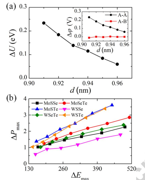 图6. A-A堆叠MoSSe双层的静电电势差随层间距离变化曲线。(a)A-A堆叠MoSSe双层的表面Se和底部S层之间的静电电势差随层间距离变化曲线。插图给出了估算的A-B和A-A堆叠MoSSe双层顶表面和底表面之间产生的电压。(b)各种Janus TMD双层在不同层间距离下最大极化改变(以pC/m为单位)随最大滑动能垒(以meV为单位)变化曲线。