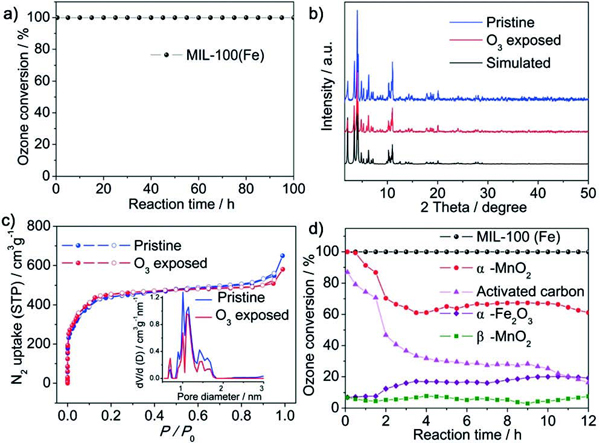 c)在暴露于臭氧之前和之后,MIL-100(Fe)的N2吸附等温线。插图:MIL-100(Fe)的孔径分布。