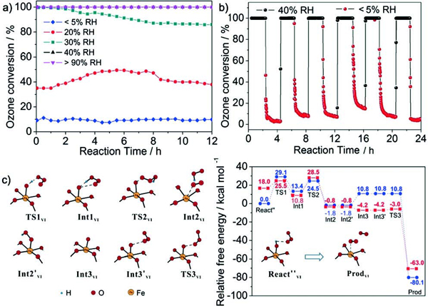 c)优化了在MIL‐100(Fe)催化臭氧分解过程中沿路径稳定点的结构和相应的势能曲线。蓝色和红线分别表示六重态和四重态MIL-100(Fe)氢氧化物复合物的能级。实验条件:用0.27g石英砂稀释0.03g催化剂,C(O3)= 45ppm,流速=1000mL min-1,RH=45%,室温。