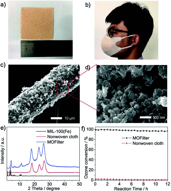 团队探索了使用MOF进行催化臭氧分解的可能性和详细机理。研究了在潮湿环境中的催化活性,发现使用MIL-100(Fe)的臭氧去除效率可以达到100%并且在45%RH的高流速下持续超过100小时。通过与多孔吸附剂(活性炭)和过渡金属氧化物催化剂(α-MnO2)的比较,进一步验证了MIL-100(Fe)的优异活性),用臭氧快速停用,在12小时内分别降至18%和60%。研究发现,当使用MOF作为活性催化剂时,水的存在有利于消除臭氧,并且在相对湿度为40%至大于90%的范围内实现臭氧的完全分解。此外,MOFilter已经被制作并用作口罩中的过滤层,以防止低水平的臭氧。这些研究结果强调了MOF对污染控制的重要性,并可能为开发臭氧分解的其他催化剂开辟新的可能性。
