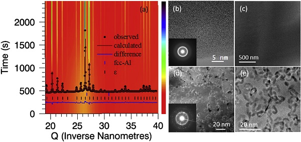近日,美国能源部Ames国家实验室staff scientist 周琳(第一作者兼通讯作者)在Acta Materialia 上发表题目为“An Abnormal Meta-stable Nanoscale Eutectic Reaction Revealed by in-situ Observations”的文章。作者使用原位高能X射线衍射(HEXRD)与原位像差校正扫描透射电子显微镜发现Al60Sm11(ε相)与其无定形前体的复杂亚稳态晶化,并揭示了其原位生长机制和动力学成因。这种新机制提供了通过亚稳相变制造具有纳米沉淀分散体的合金结构的新途径。