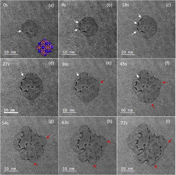 ε相最初具有均匀的对比度,随着它长到~25nm,在晶粒内部观察到一些较暗的对比区域