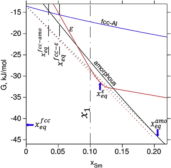 图五 175℃下fcc-Al,无定形,液体和ε-Al60Sm11相吉布斯自由能计算
