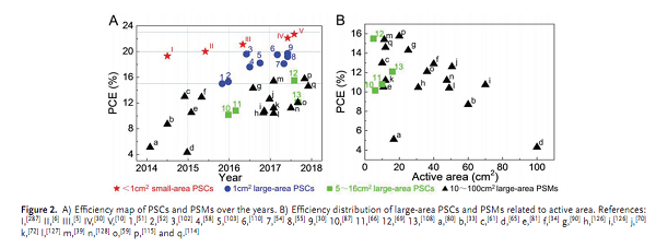 金属卤化物钙钛矿太阳电池作为最优前景的第三代光伏技术,最近得到了科学界和工业界的广泛关注。迄今为止,小面积PSC的功率转换效率已超过23%,接近商用硅光伏电池。但是大多数经过认证或报道的高效钙钛矿光伏器件(PCE>20%),其有效面积较小,一般在0.03~0.1cm2左右。随着器件有效面积的扩大,器件效率呈明显的下降趋势,这制约了钙钛矿光伏器件的工业化进程。器件有效面积扩大导致的效率和稳定性问题迫切需要关注和解决。