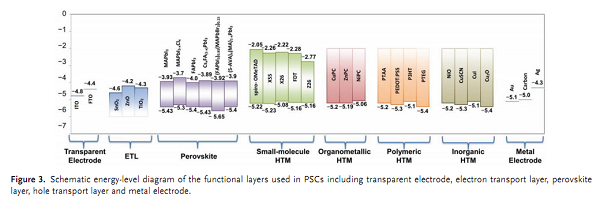 目前对于大面积n-i-p型钙钛矿光伏器件来说,无机金属氧化物电子传输材料是最常用的,作者认为应进一步开发可大面积制备电子传输材料的低温处理技术。对于反式p-i-n型钙钛矿光伏器件,最常用的电子传输材料是富勒烯C60及其衍生物PCBM,但是其具有与环境稳定的金属电极不匹配的功函数的问题,作者认为开发非富勒烯衍生物迫在眉睫。