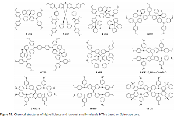 目前报道的用于大面积制备钙钛矿光伏器件的空穴传输材料较少,应用较多的主要是Spiro-OMeTAD,然而该材料并不适用于大面积器件制备,主要是由于其合成成本高,空穴迁移率低,需要使用易吸水的掺杂剂等。因此面向大规模制备钙钛矿光伏器件的空穴传输材料除了要具有基本要求,如高空穴迁移率,与钙钛矿精确匹配的能级,良好的溶解性,高热稳定性和光化学稳定性以及高疏水性,还应该具有以下关键优势,例如高效率,非掺杂和低成本。在本章节,作者详细介绍了具有大面积器件制备前景的空穴传输材料以及未来材料设计的发展方向。内容涵盖不同结构的高效率、低成本的小分子HTMs、不同结构的高效率、非掺杂的聚合物HTMs,高效有机金属HTMs和成本低廉、空穴迁移率高的无机HTMs。
