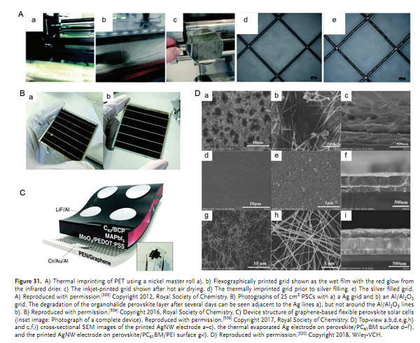 金属纳米线电极、金属网络电极和碳基电极在制造大规模PSC方面具有很好的优势,如低成本,高稳定性,易于大规模制造等。然而,仍需要进一步开发和优化器件性能和处理技术。