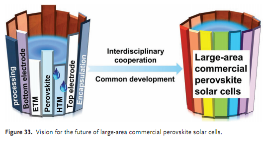 目前,关于大面积钙钛矿光伏器件的研究集中在钙钛矿活性层,但是正如木桶效应所揭示的那样,木桶的容量取决于最短的板。为了实现钙钛矿光伏器件商业化的最终目标,需要科学家们跨学科夸专业的进行合作,寻找稳定钙钛矿材料,选择合适的电荷传输材料和电极材料,以及开发低成本的制备工艺。相信在不久的将来,钙钛矿太阳能电池将成为硅太阳能电池最具竞争力的替代者之一